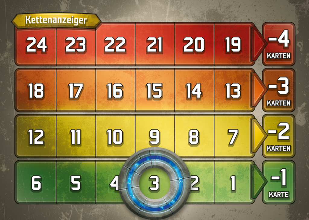 Ketten haben somit einzig und alleine beim Auffüllen der Hand eine Auswirkung, also am Spielanfang und am Ende jeder Runde. Der Spieler zieht dann so viele Karten weniger wie es der Kettenstufe entspricht, im obigen Fall würde ein Spieler als zu Beginn eines Spieles auf 5 Karten aufziehen (6 wenn er Startspieler ist) und sprengt dann eine Kette.