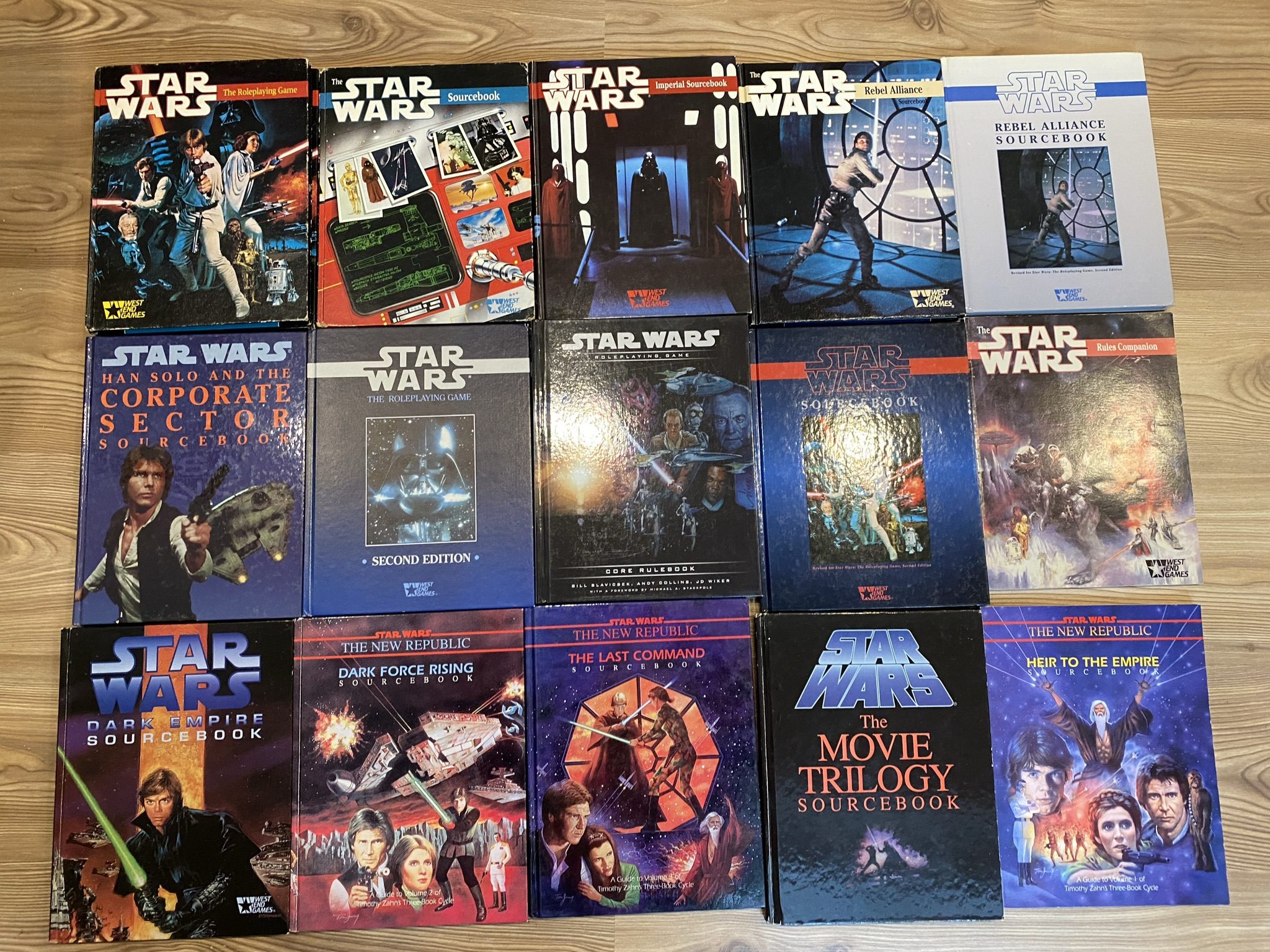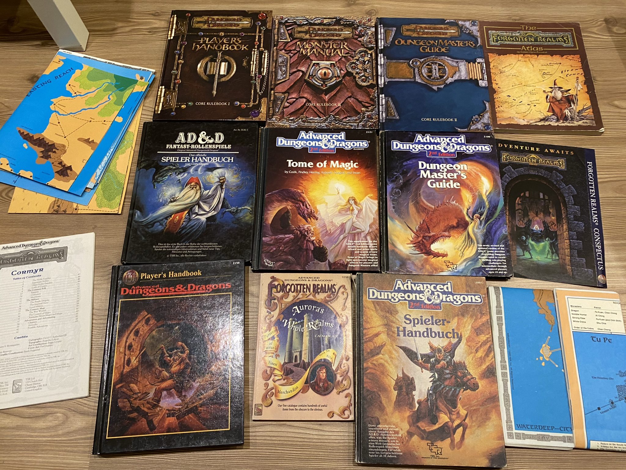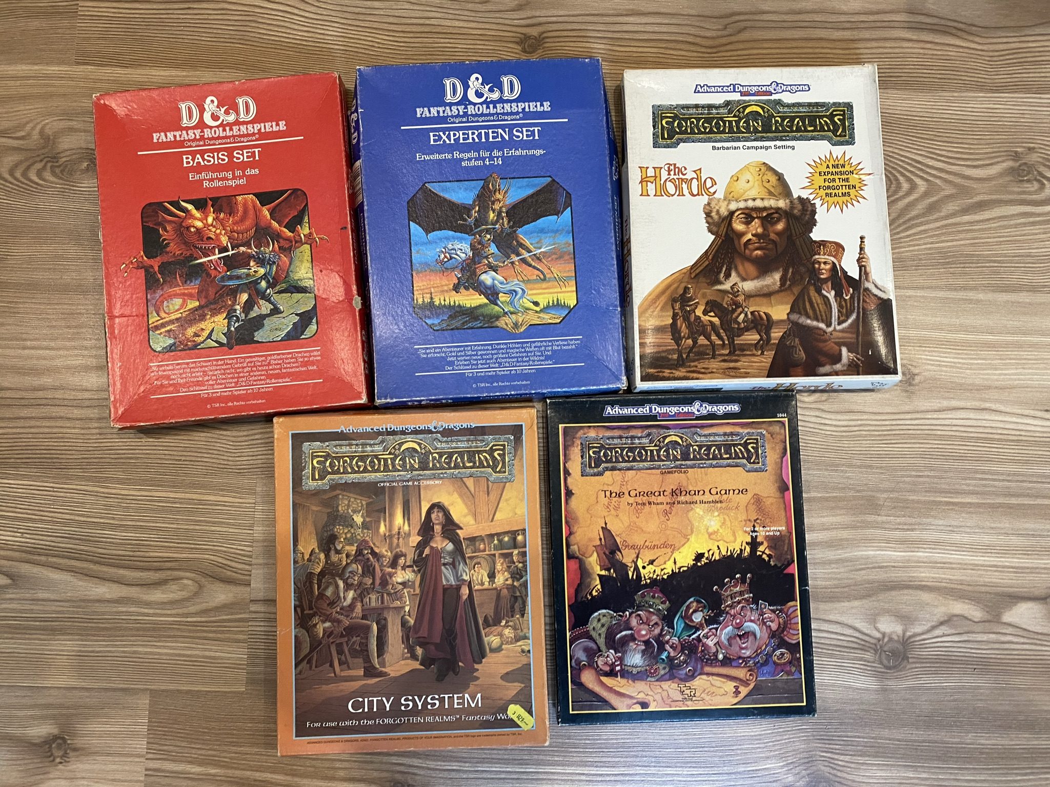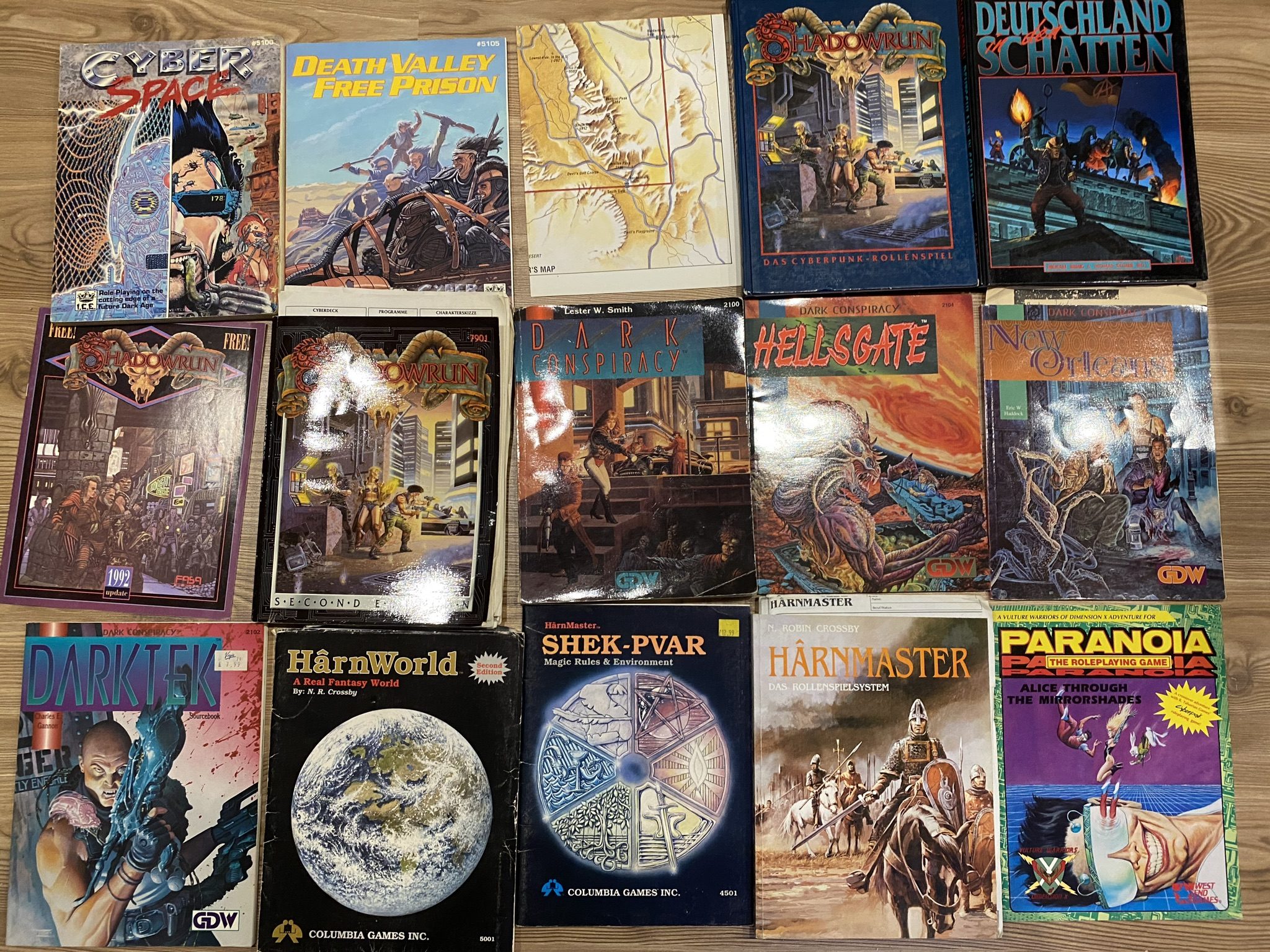 Im ersten Teil gehören zu den „einzuräumenden Dingen“ natürlich meine Rollenspiele. Von der original „Roten Box“ Dungeons & Dragons, über verschiedene Ausgaben von DSA, Hintergrund Infos zu den „Forgotten Realms“, ne Menge Star Wars D6, etwas Shadowrun und das unglaublich geniale „Hârnmaster“ bis hin zu Cyberpunk ist alles vertreten.